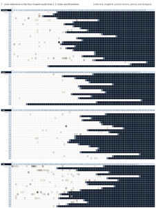 The cross references are from the NIV. Greater weight is given to cross references that are more exacting (8) and lesser weight to those that are only of interest (1). Cross references of in-between weight are assigned an in-between factor. Additional weight is assigned when there are multiple cross references to the same verse.